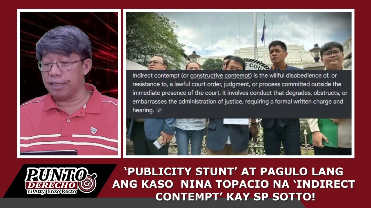 Ano nga ba ang indirect contempt? Sa batas, ito ay ang pagkilos o pahayag na humahadlang sa pagpapatupad ng desisyon ng korte, na hindi direktang nagaganap sa loob ng courtroom. Kung direct contempt, naroon ka mismo sa korte at sinasadya mong bastusin o hadlangan ang proseso. Pero sa kaso ni Sotto, ang mga pahayag niya ay sa labas ng korte, at siya’y nag-express ng opinyon lamang.